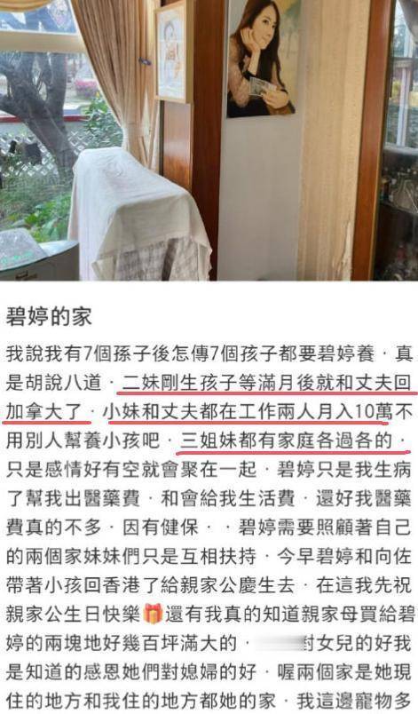 也就是说作为家中老大的郭碧婷是要给父亲生活费和药费。而两个妹妹并没有依靠姐姐,二妹生完孩子后要去加拿大生活了。小妹妹两口子月收入10万元,也不需要靠姐姐郭碧婷。